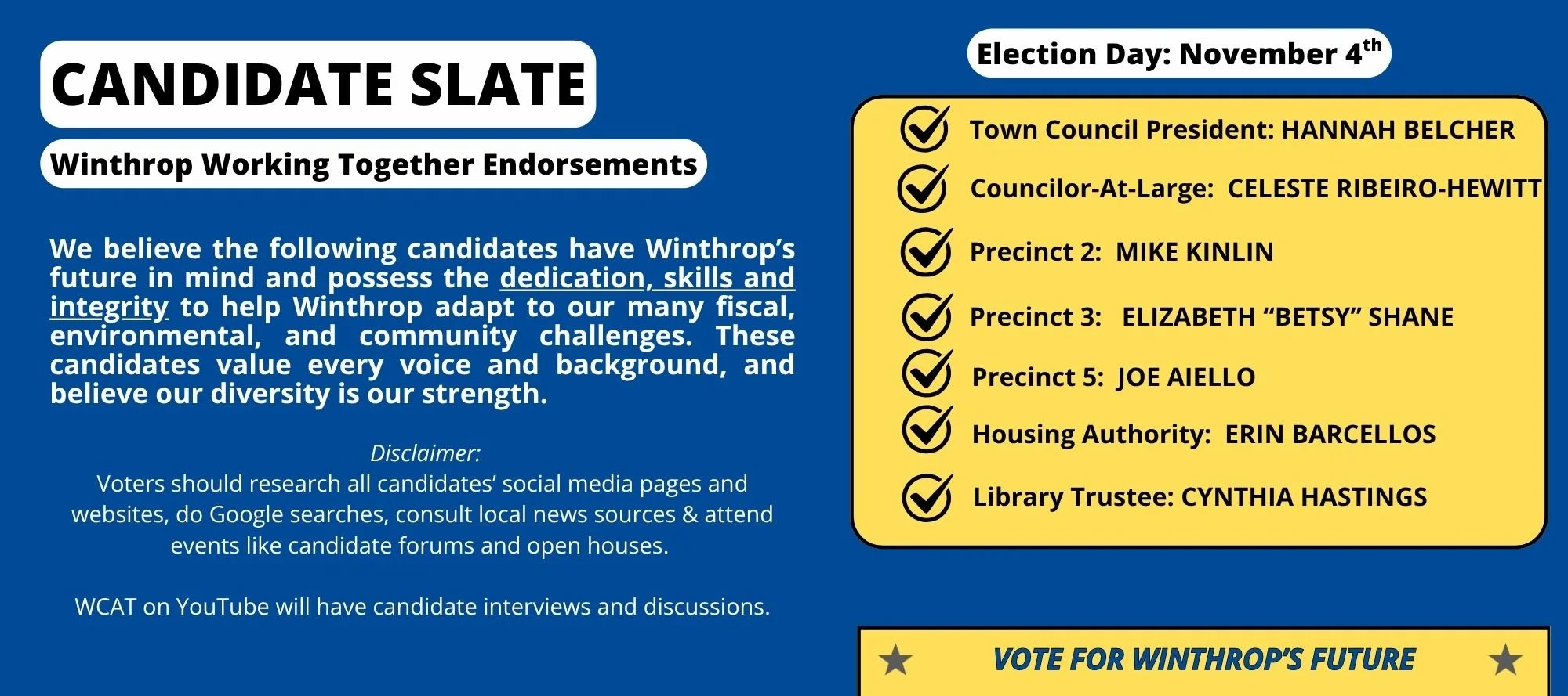 We aim to create opportunities for people in Winthrop to access resources and information about the paramount issues facing our community and to engage in open, respectful dialogue and collaboration towards addressing them.
